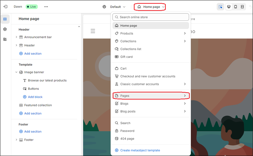 - Create a new page template. From the Home page drop down, click Pages and select Create template.