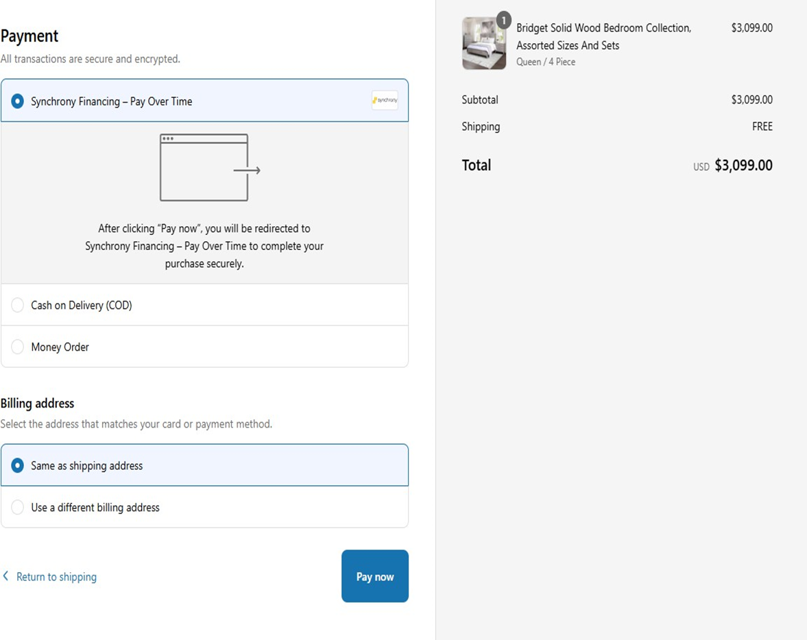 - Add a sample item to the cart and go to checkout. You should see the Synchrony Financing - Pay Over Time option. This verifies it is set up correctly.