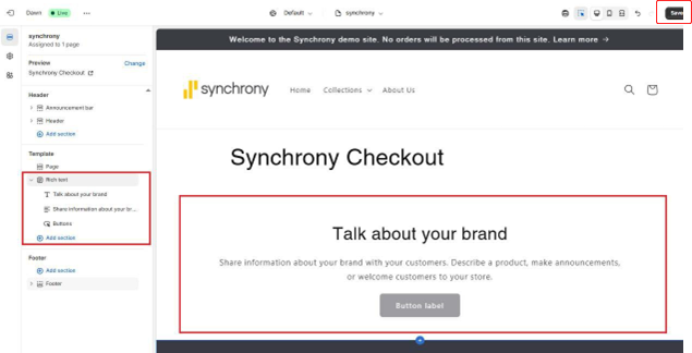 - On the Synchrony Checkout page editor, change the Theme template to the Synchrony template you created in the steps above and click Save.